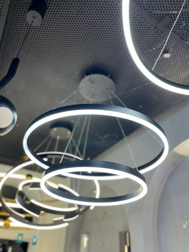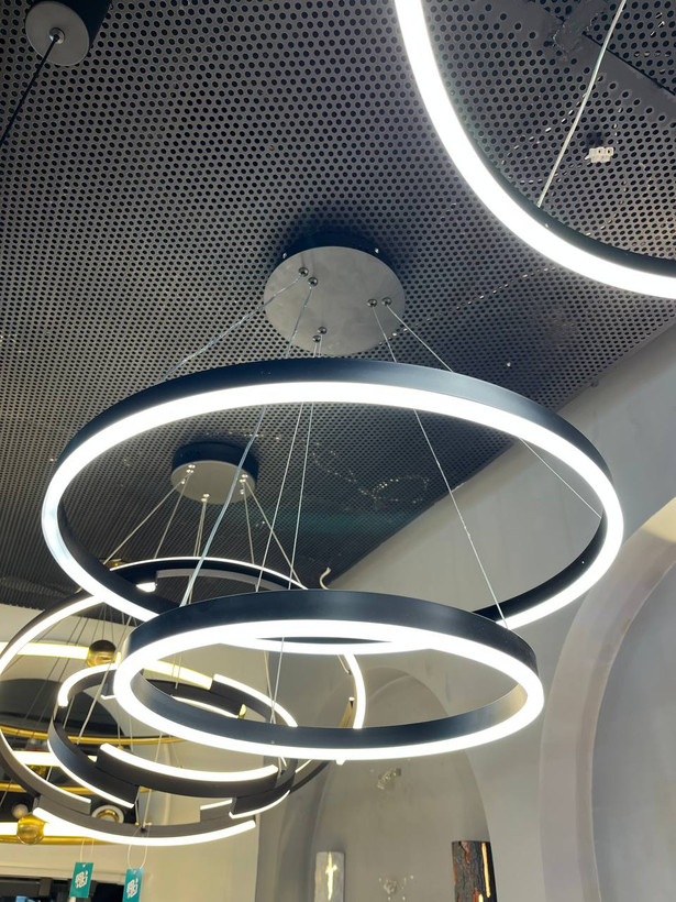 - فضای پذیرایی یا هال بزرگ: با ابعاد «دو طبقه» حلقهها در سایز ۶۰ و ۴۰ سانتیمتر، این لوستر میتواند نقطه کانونی زیبایی در فضای نسبتاً بزرگتر باشد، به ویژه سقفهای بلندقامت یا اتاقهای با عرض مناسب.