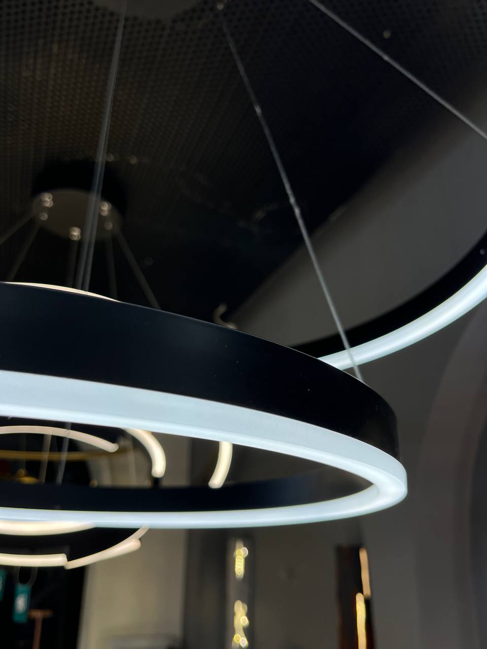 - فضای پذیرایی یا هال بزرگ: با ابعاد «دو طبقه» حلقهها در سایز ۶۰ و ۴۰ سانتیمتر، این لوستر میتواند نقطه کانونی زیبایی در فضای نسبتاً بزرگتر باشد، به ویژه سقفهای بلندقامت یا اتاقهای با عرض مناسب.